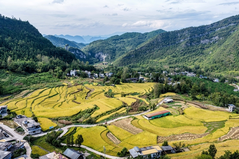 地处武陵山区腹地的重庆市黔江区五里镇水稻种植面积5300亩,是武陵山地区粮食主要产区之一。秋收时节,金黄色的水稻铺满山坡,稻农们利用晴好天气抢收稻谷,呈现出一派美丽的丰收画卷。