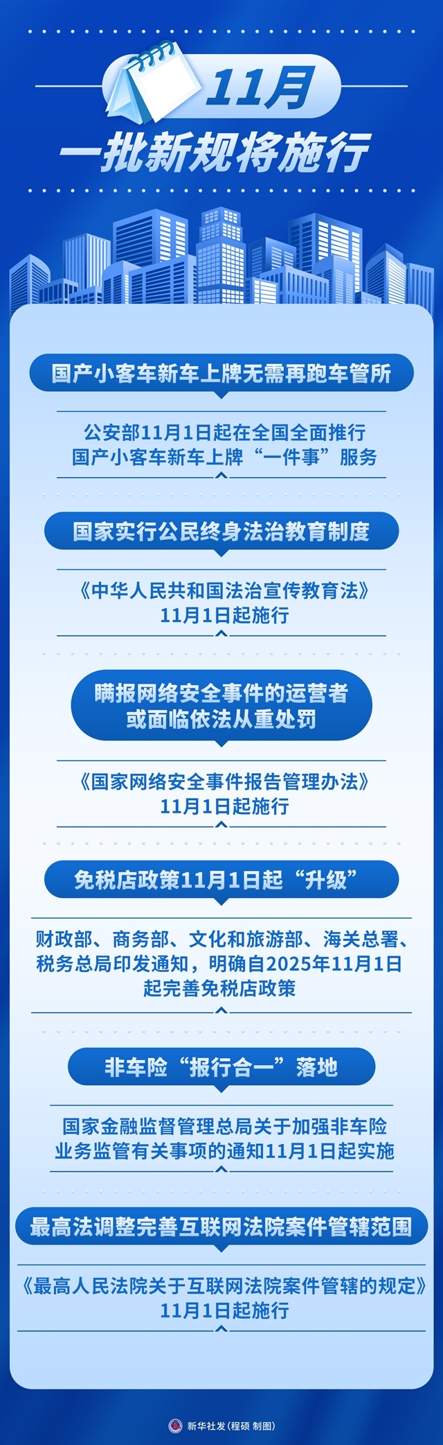 无需再跑车管所,国产小客车新车上牌全业务数字化办理;明确国家实行公民终身法治教育制度;对瞒报网络安全事件造成重大危害后果的运营者依法从重处罚……11月起施行的这些新规,一起来看!